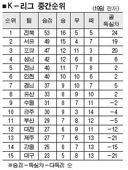 전남과 인천 역시 최소한 1승을 챙길 수 있다는 자체 분석이다. 경남이 성남에 무릎을 꿇는다면 어느 정도 PO 진출에 대한 압박을 덜 수 있다. 하지만 경우의 수를 따질 필요도 없이 무조건 총력전으로 나설 태세. 전남은 24일 13위로 처진 제주와 다소 쉬운 29라운드를 치른 뒤 다음달 1일 선두 탈환의 희망을 품은 FC서울과 힘겨운 승부를 맞는다. 인천은 25일 서울에 이어 새달 1일 11위 부산과 겨룬다.