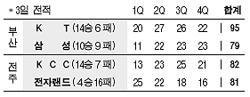 전자랜드는 마지막 공격권을 잡았지만 턴오버를 범해 역전찬스를 날려버렸다. KCC 강병현(15점)은 승부가 갈린 4쿼터에만 무려 9점을 몰아쳤다.