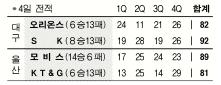 이후 한번도 리드를 내주지 않았다. 주희정(13점 7어시스트), 변현수(17점), 김민수(15점), 워커가 골고루 활약했다. 경기종료 시점 90-79. SK 승리였다. 울산에선 모비스가 KT&G를 86-81로 눌렀다. 모비스(14승 6패)는 다시 KT와 공동 1위가 됐다.