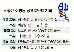 이청용은 16일 영국 볼턴 리복스타디움에서 열린 웨스트햄과의 2009~10프리미어리그 홈경기에서 후반 19분 선제골을 터뜨려 3-1 승리의 주역이 됐다. 지난 주말 맨시티전 어시스트에 이은 두 경기 연속 공격포인트. 양팀 최고 평점(8점)과 ‘맨오브더매치’ 역시 이청용 차지였다.