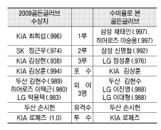김상현, 최희섭, 정근우,박용택은 모두 골든글러브의 대상이 아니다? 이들은 모두 최고의 내·외야수로 올해 프로야구에서 골든글러브를 수상했던 선수들. 그러나 미국 프로야구의 골드글러브처럼 정규시즌 최고의 수비수들에게 상을 준다면 이 같은 의문은 사라지게 된다. 이들보다 수비율이 훨씬 좋은 선수들은 따로 있다.경기에서 실수 하나가 경기의 흐름을 완전히 뒤집어 놓는 만큼 좋은 수비는 우승의 충분조건이다.