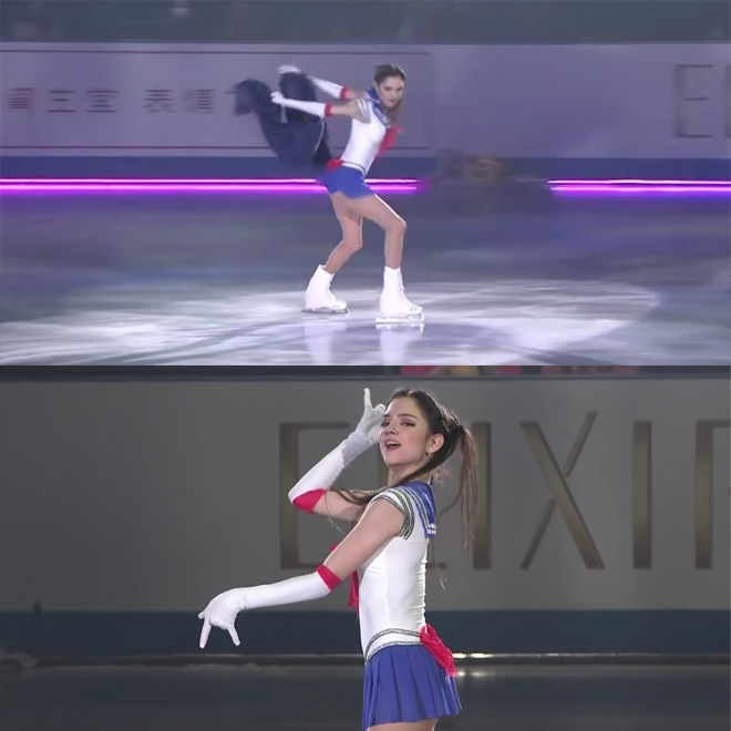 이날 세일러문 복장을 한 예브게니아는 빙상 위에서 애니메이션 ‘세일러문’ OST에 맞춰 덕후력(?)이 돋보이는 쇼를 선보이는가 하면 세일러문으로 변신하는 과정부터 세일러문의 하이라이트 대사인 “정의의 이름으로 널 용서하지 않겠다”까지 완벽하게 재연해 눈길을 끌었다.