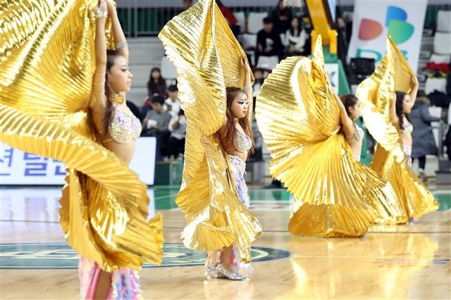 어린이들의 밸리댄스 10일 강원 원주종합체육관에서 열린 2018-2019 SKT 5GX KBL 프로농구 원주DB프로미와 서울SK나이츠 경기에서 원주 어린이 밸리댄스팀이 축하공연을 하고 있다. 2019.2.10 뉴스1