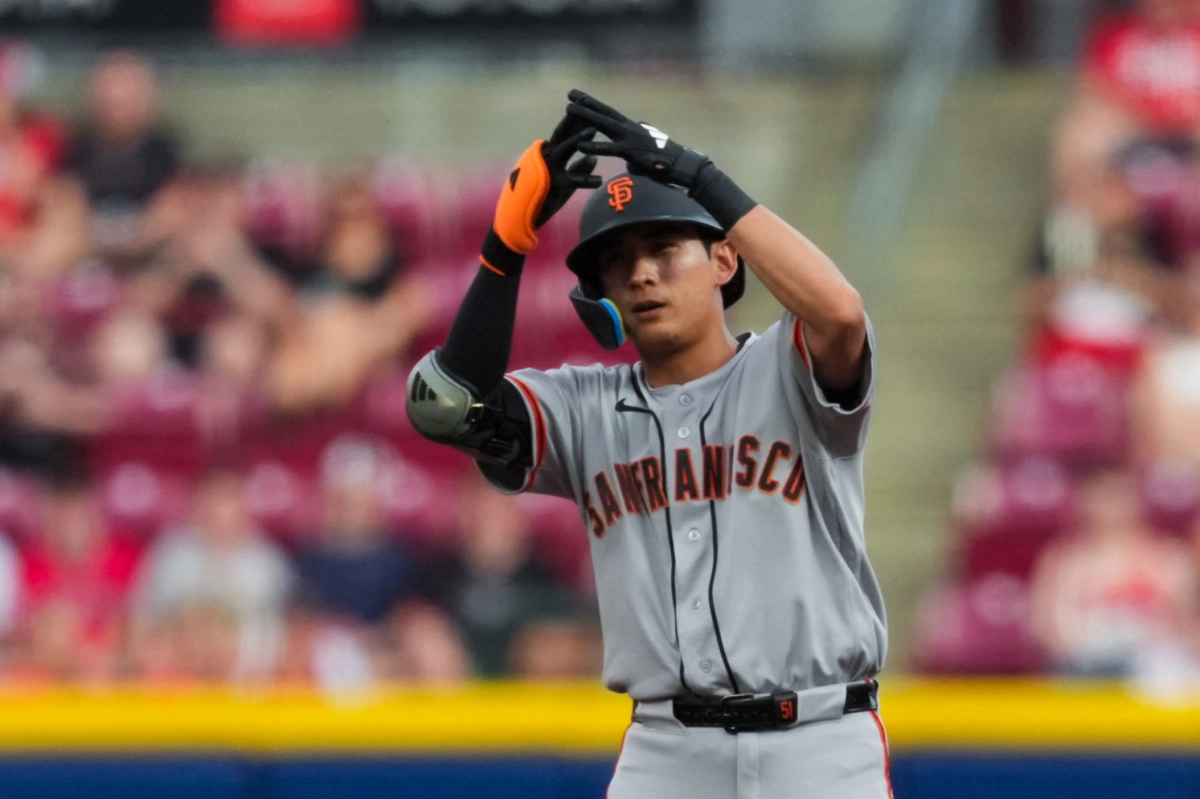 샌프란시스코 자이언츠 이정후가 15일(한국시간) 미국 오하이오주 신시내티 그레이트아메리칸볼파크에서 열린 2026 미국 프로야구 메이저리그(MLB) 신시내티 레즈전에서 4회초 2루타를 치고 세리머니를 하고 있다. 2026.4.14 신시내티 로이터 연합뉴스