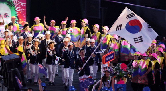 리우데자네이루올림픽에 출전한 한국 선수단이 지난 5일(현지시간) 브라질 리우데자네이루 마라카낭 주경기장에서 태극기를 휘날리며 52번째로 입장하고 있다.