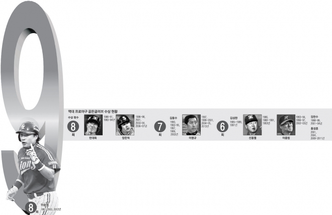 야구 글러브에 금색 칠을 한 ‘골든글러브’ 제작 비용은 100만원 내외지만, 선수들에게는 돈과 바꿀 수 없는 영광이다. 33년을 맞은 프로야구에서 황금 장갑을 아홉 번 낀 선수는 아직 나타나지 않았다. 호남과 영남을 대표했던 강타자 한대화 KIA 수석 코치와 양준혁 MBC 스포츠플러스 해설위원이 여덟 번까지 끼어 봤지만, 노쇠화로 아홉 번째 수상에는 실패했다. ‘국민타자’ 이승엽(삼성)이 올해 그 신기록에 도전한다.