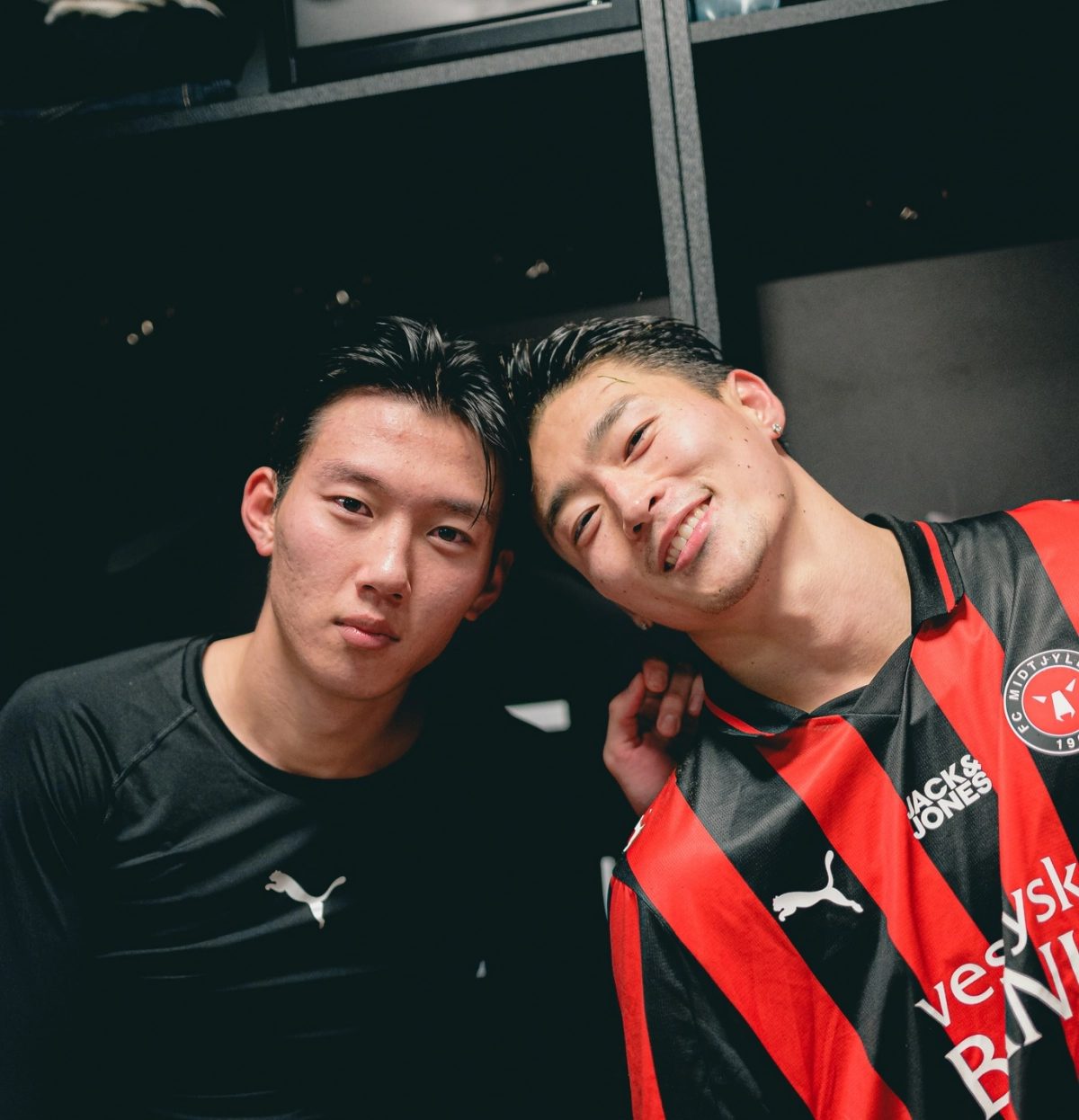 미트윌란 이한범과 조규성이 1일(한국시간) 덴마크 헤르닝 MCH 아레나에서 열린 2025~26 덴마크 수페르리가 17라운드 노르셸란과의 홈경기에서 6-0으로 승리한 뒤 기뻐하고 있다. 미트윌란 소셜미디어